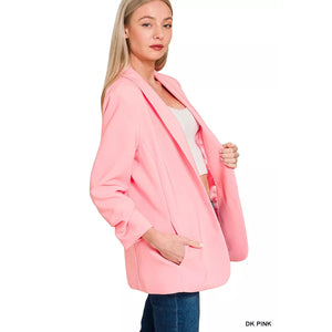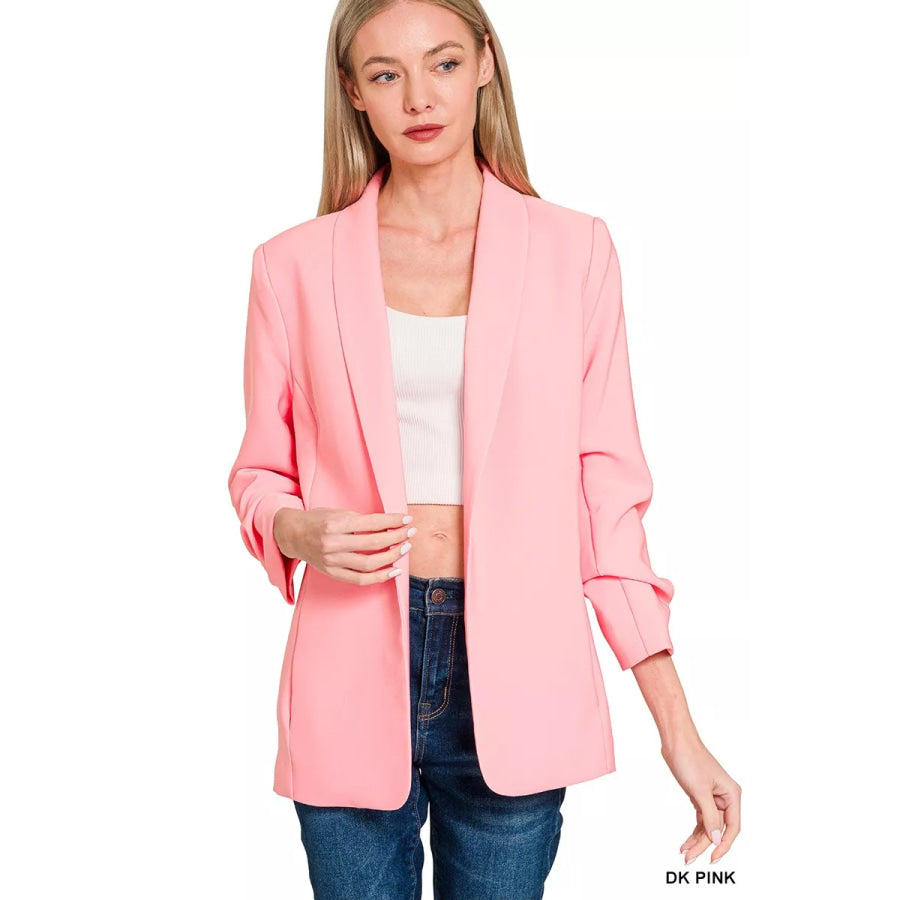 Zenana Woven 3/4 Ruched Sleeve Open Front Classic Blazer