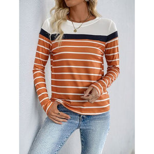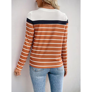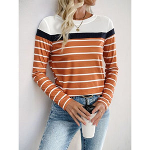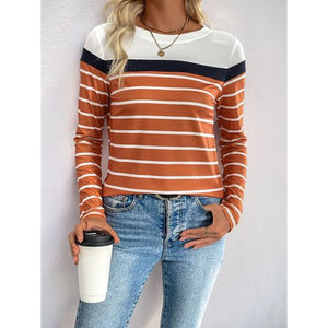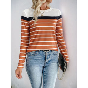 Perfee Contrast Striped Round Neck Long Sleeve T-Shirt
