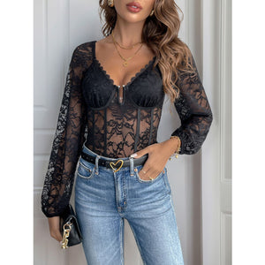 Perfee Lace V-Neck Long Sleeve Bodysuit