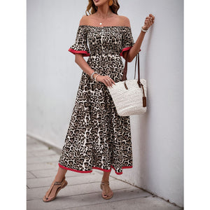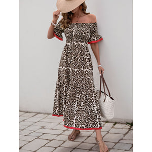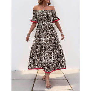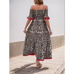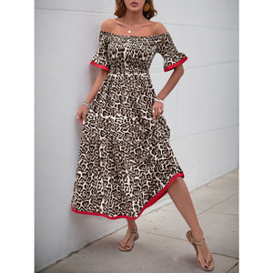 Perfee Leopard Off-Shoulder Flounce Sleeve Midi Dress