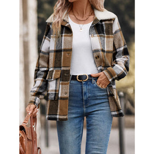 Perfee Pocketed Plaid Button Up Collared Neck Jacket