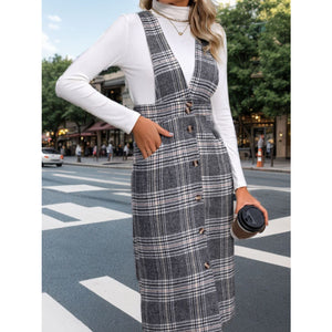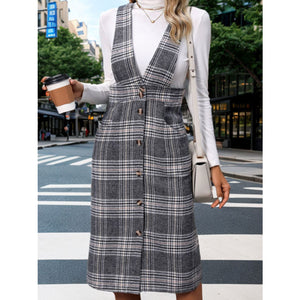 Perfee Pocketed Plaid Overall Dress
