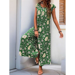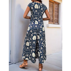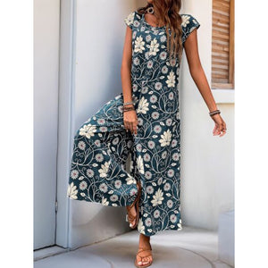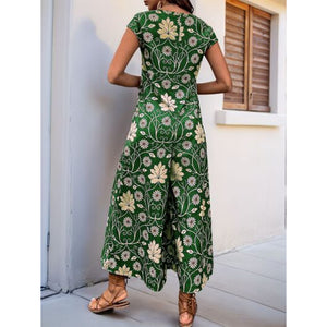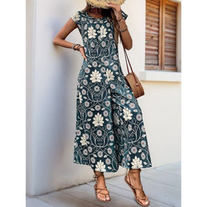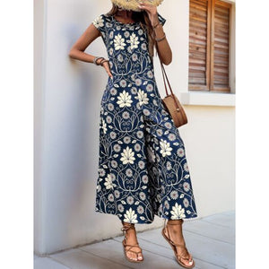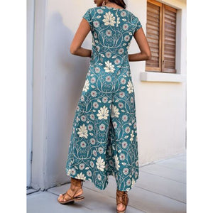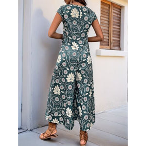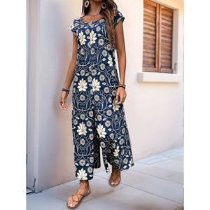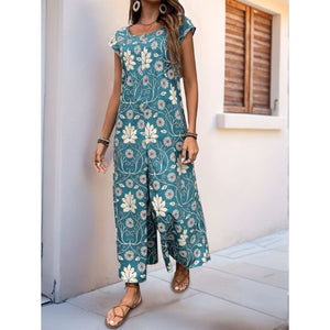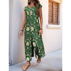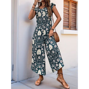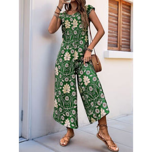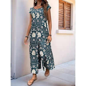 Perfee Printed Round Neck Cap Sleeve Wide Leg Jumpsuit