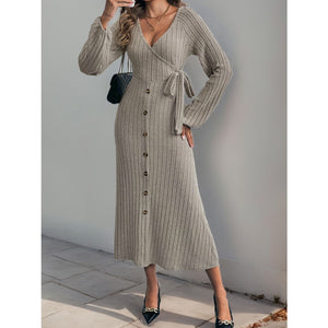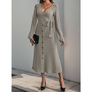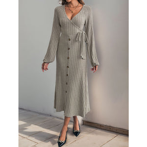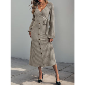 Perfee Ribbed Tied Surplice Long Sleeve Dress