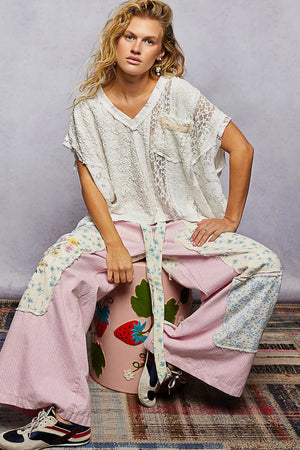 POL Asymmetrical V-Neck Short Sleeve Lace Top