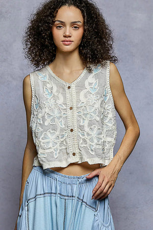 POL Button Down Floral Embroidery Cropped Crochet Vest Top