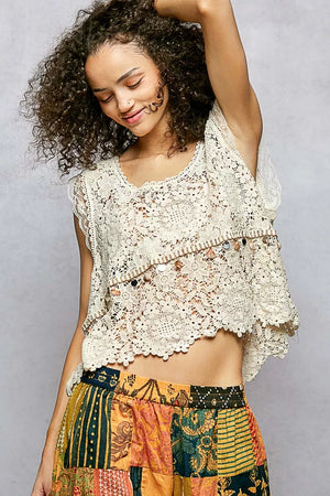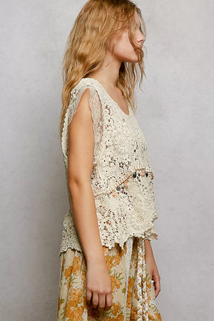 POL Lace Trim Openwork V-Neck Crochet Tank with Scalloped Edge
