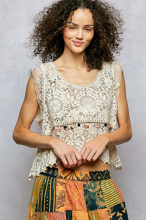 The round neck flowy fit sleeveless top in crochet is a beautifully designed piece that exudes femininity and charm. Featuring intricate lace trim, dangle trim, and a scalloped edge, this top offers delicate detailing for a romantic touch. The flowy fit adds a breezy and effortless quality to the top, perfect for a relaxed yet stylish look. Embrace the elegance of this crochet top, which can be dressed up for special occasions or worn casually with your favorite bottoms. Elevate your ensemble with this lovely top that combines texture, style, and sophistication.