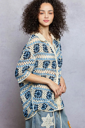 POL Openwork Short Sleeve Crochet Shirt with Border Accents