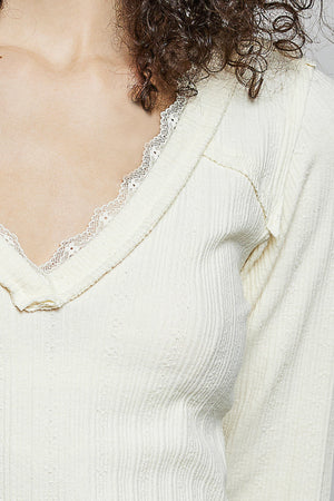 POL V-Neck Long Sleeve Ribbed Top with Lace-Accent Neckband