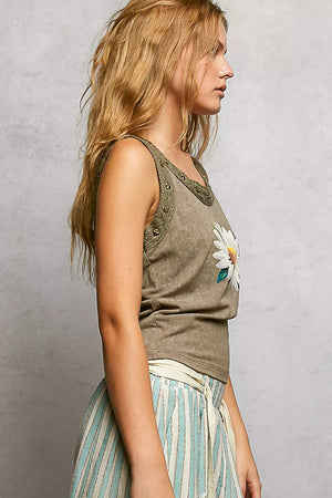 POL Washed Floral Stud Round Neck Slim Tank