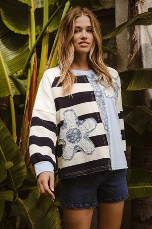 BiBi Patchwork Striped Round Neck Sweatshirt