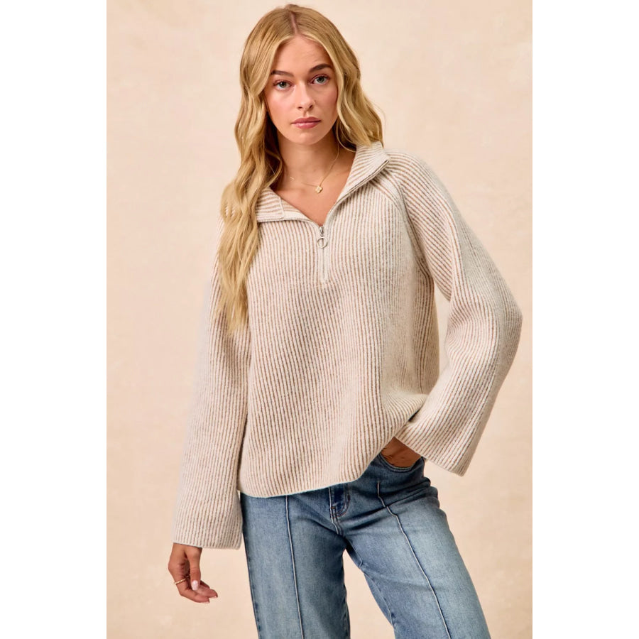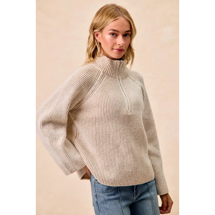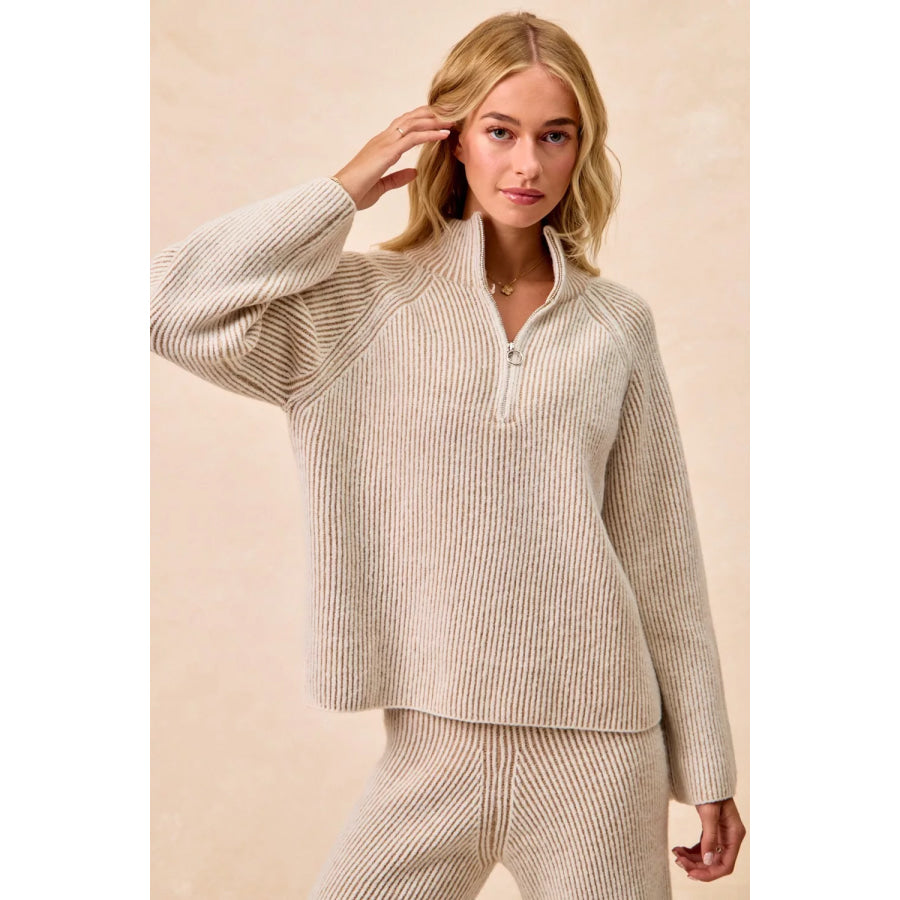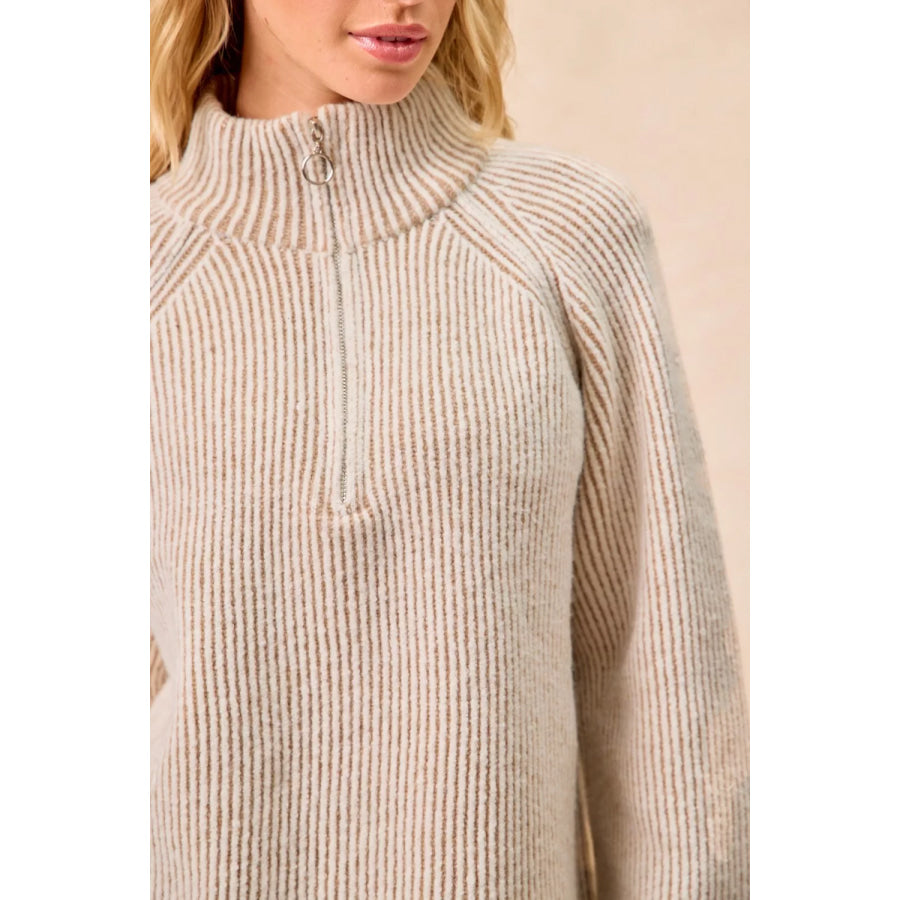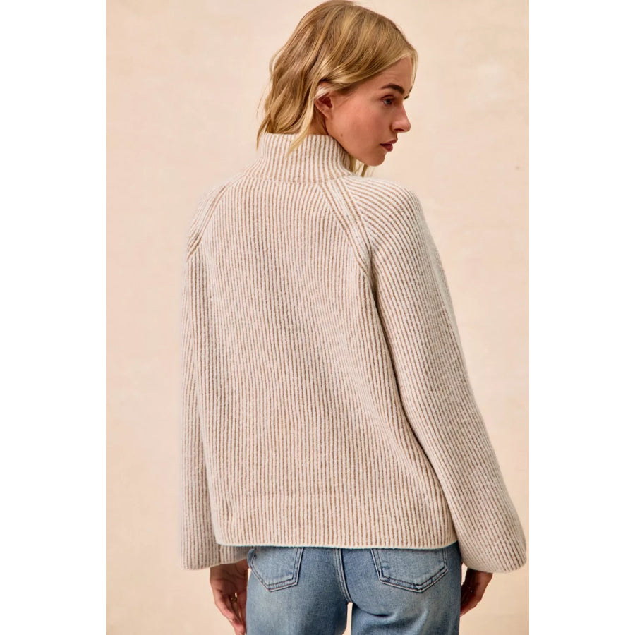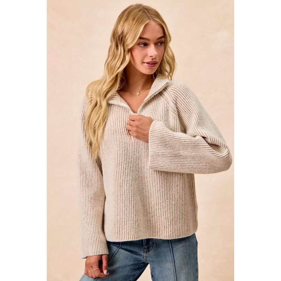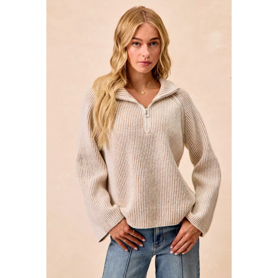 BiBi Two Tone Rib Texured Knit Collared Top with Zip Up