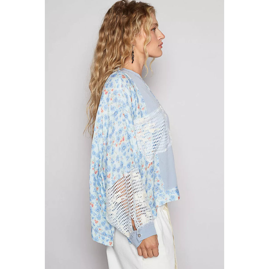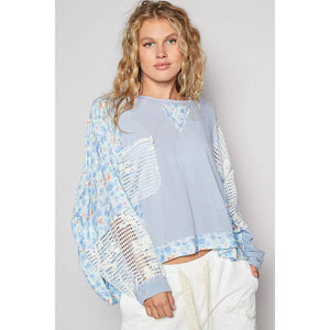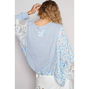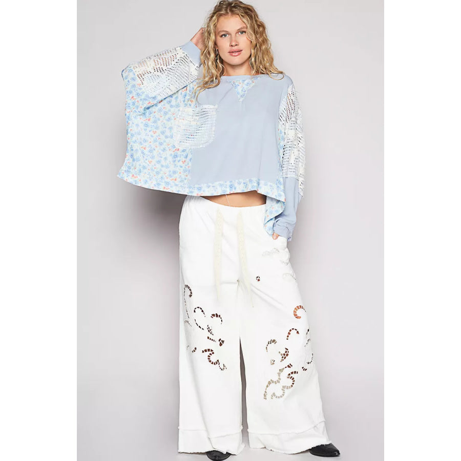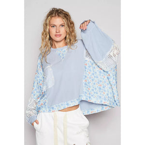 POL Round Neck Cropped Gauze Floral Pattern Top with Overlock Stitch Detail