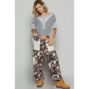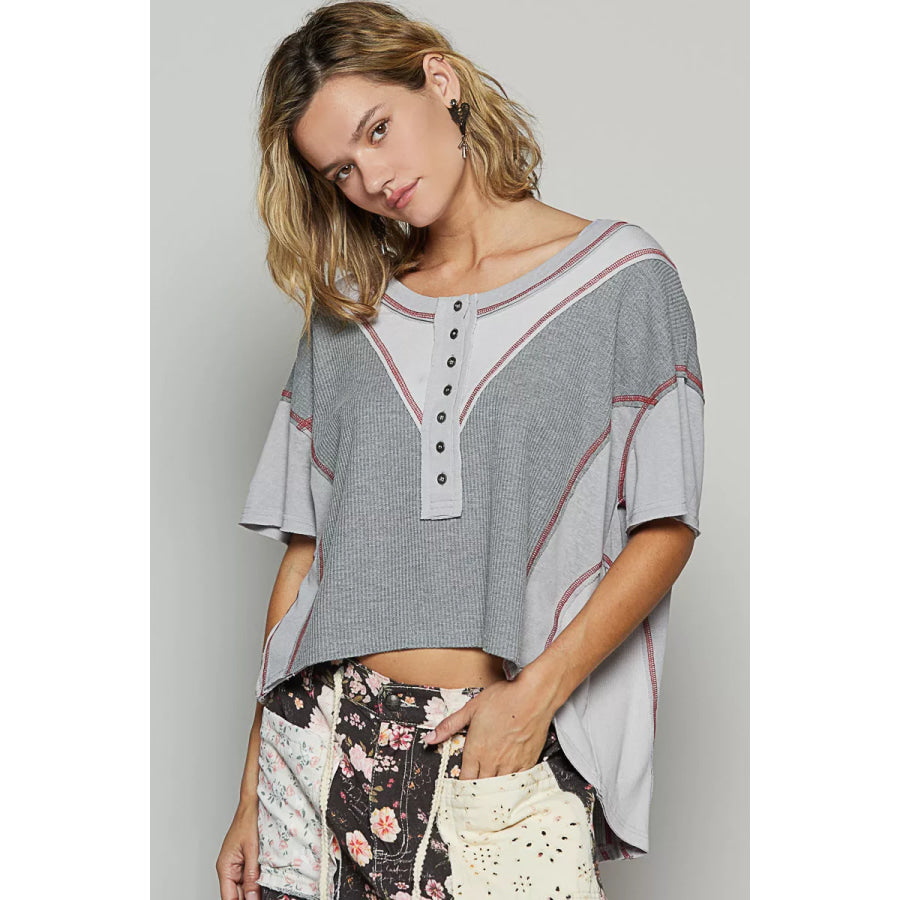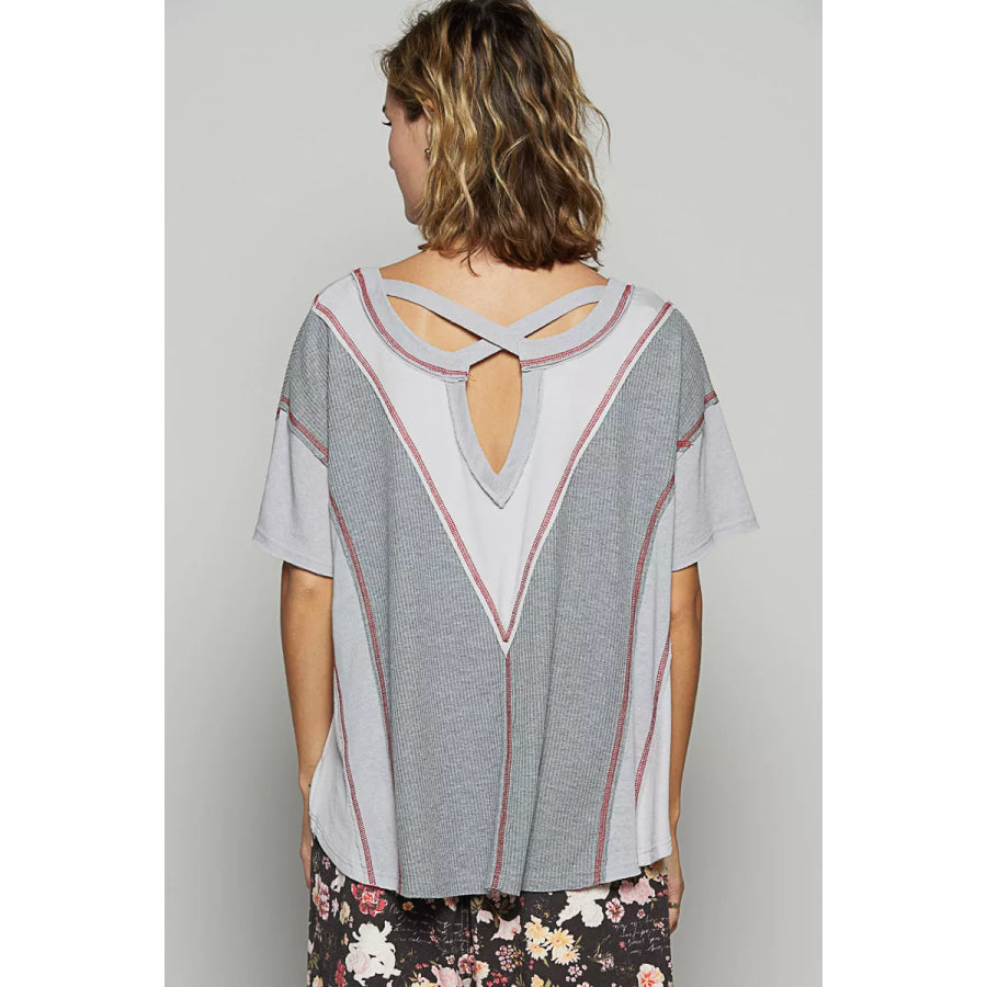 POL Round Neck Short Sleeve Contrast Stitching Top with Back Strap Detail
