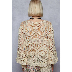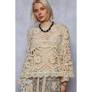 This round neck, 3/4 sleeve cropped fit top is a stylish and trendy choice for any fashion-forward individual. Made from crochet with various weave knit patterns, it offers a unique and intricate design that sets it apart from basic tops. The cropped fit is flattering and perfect for pairing with high-waisted bottoms for a contemporary look. The 3/4 sleeves add a touch of sophistication while keeping you cool and comfortable. Whether you're heading out for a casual day or a special occasion, this top is sure to elevate your outfit with its chic and detailed design.