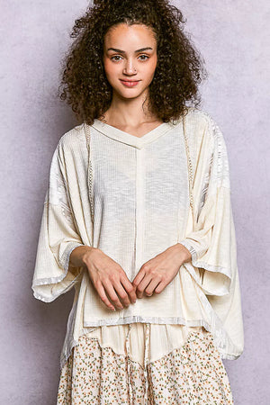 This V-neck short sleeve relaxed fit basic airy hoodie top is designed with intricate details for a stylish and modern look. The ribbed texture and lace patch trim add a delicate and feminine touch to the hoodie. The design features a unique hoodie loop, outseam and overlock stitch point, and panel opening point for added interest and dimension. The vintage washing gives the top a lived-in feel, creating a casual and laid-back vibe. Available in a solid color, this hoodie top is versatile and perfect for both casual outings and lounging at home.