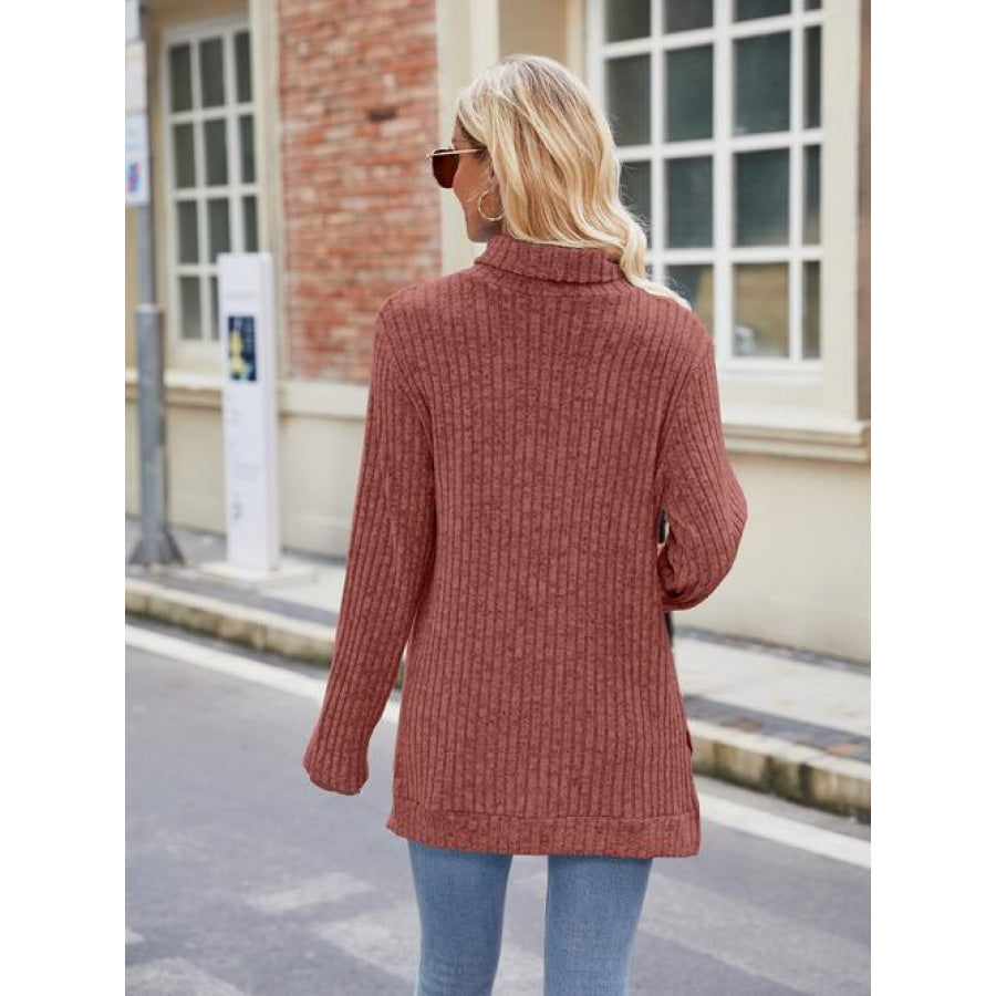 Ribbed Turtleneck Long Sleeve Slit Knit Top