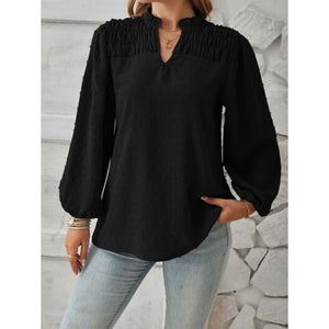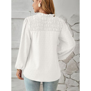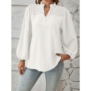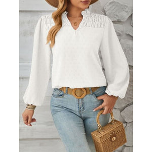Ruched Swiss Dot Notched Balloon Sleeve T-Shirt