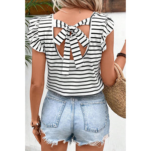 Tied Striped V-Neck Cap Sleeve T-Shirt