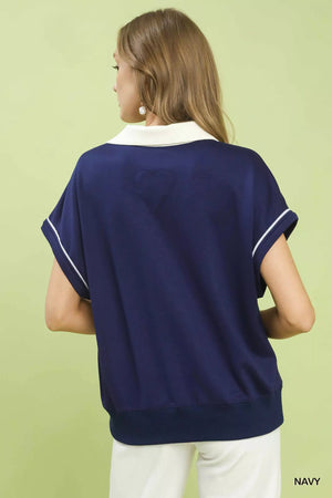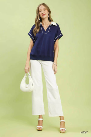 Umgee Contrast Collar Soft Knit Polo Top