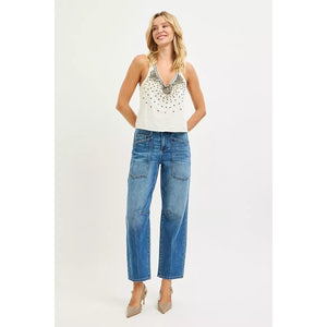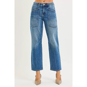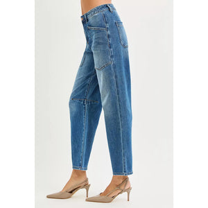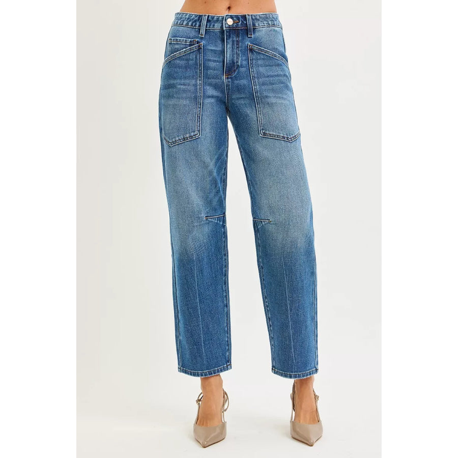 RISEN 4 Way Stretch Mid Rise Barrel Jeans with Patch Pocket Detail