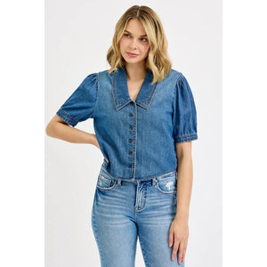RISEN Button Down Puff Sleeve Crop Denim Shirt