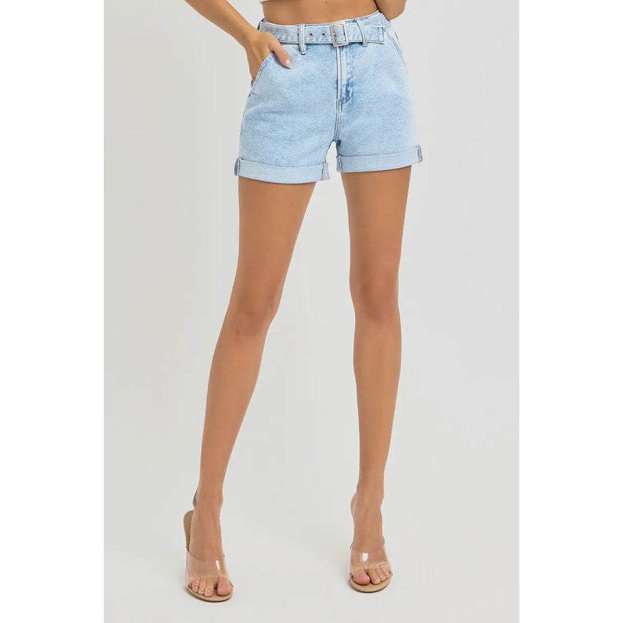 These premium high-waisted denim shorts feature a flattering silhouette with a light wash finish. Made from durable cotton blend denim material that offers both comfort and style. The included matching belt adds a fashionable accent while the rolled cuffs provide a casual, laid-back look. The high-rise design elongates the legs while the relaxed fit through the hips ensures all-day comfort. Classic 5-pocket styling maintains traditional denim elements while modernizing the overall appearance. Perfect for warm weather and casual occasions.