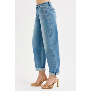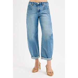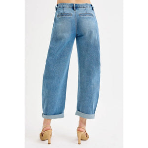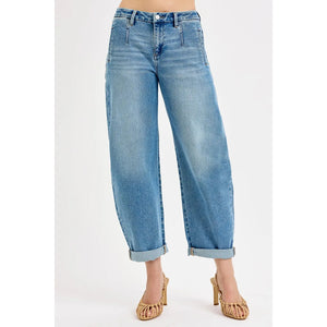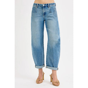 RISEN Full Size Mid Rise Fit Barrel Roll Up Jeans Plus Size