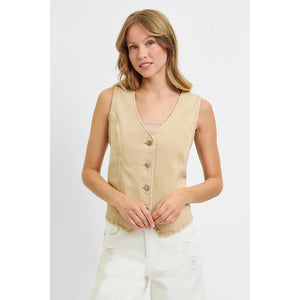 The v-neck button-down vest is a chic and versatile layering piece for your wardrobe. With a flattering v-neckline and classic button-down closure, this vest offers a polished and sophisticated look. Perfect for adding a stylish touch to any outfit, whether paired with a blouse and trousers for a professional ensemble or with a tee and jeans for a more casual vibe. Stay stylish and comfortable with the v-neck button-down vest for a sleek and on-trend outfit.