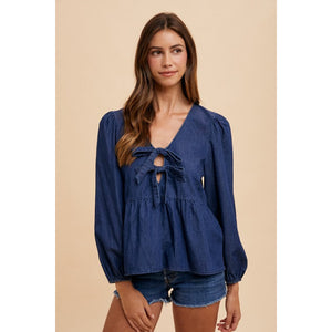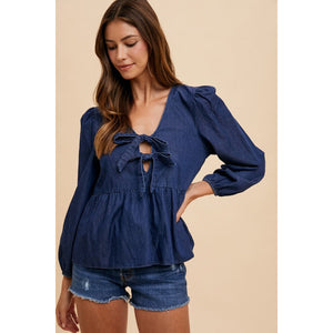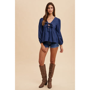 Annie Wear Tie Front Peplum Long Sleeve Denim Top