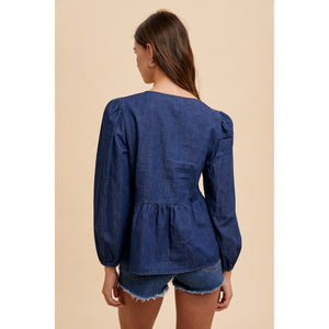 The Tie Front Peplum Long Sleeve Denim Top is a trendy and elegant top. It features a stylish tie front detail that adds a feminine touch. The peplum design enhances the silhouette by defining the waist and creating a flattering look. With long sleeves, it is perfect for transitioning between seasons. This blouse is versatile and can be dressed up or down for various occasions.
