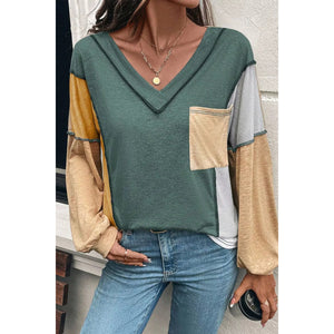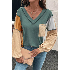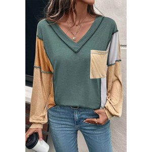 This fashion color block V-neck long sleeve T-shirt is a must-have addition to your wardrobe. Crafted from a soft and breathable blend of cotton and polyester, this top offers both comfort and style. The eye-catching color block design adds a modern touch, while the flattering V-neckline enhances your silhouette. The convenient chest pocket adds a functional detail. Perfect for casual outings or layering under jackets, this T-shirt is versatile and easy to style. The relaxed fit ensures all-day comfort, making it ideal for everyday wear. Available in a range of sizes to suit every body type.