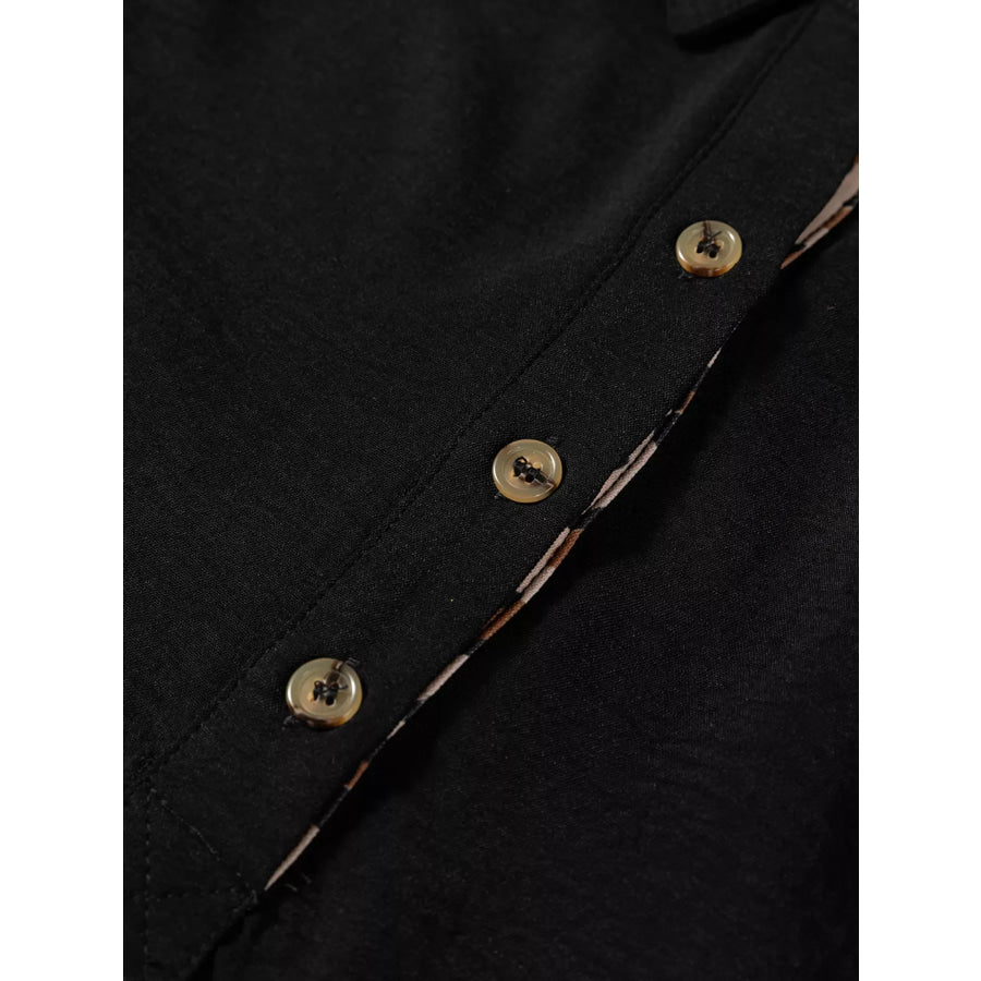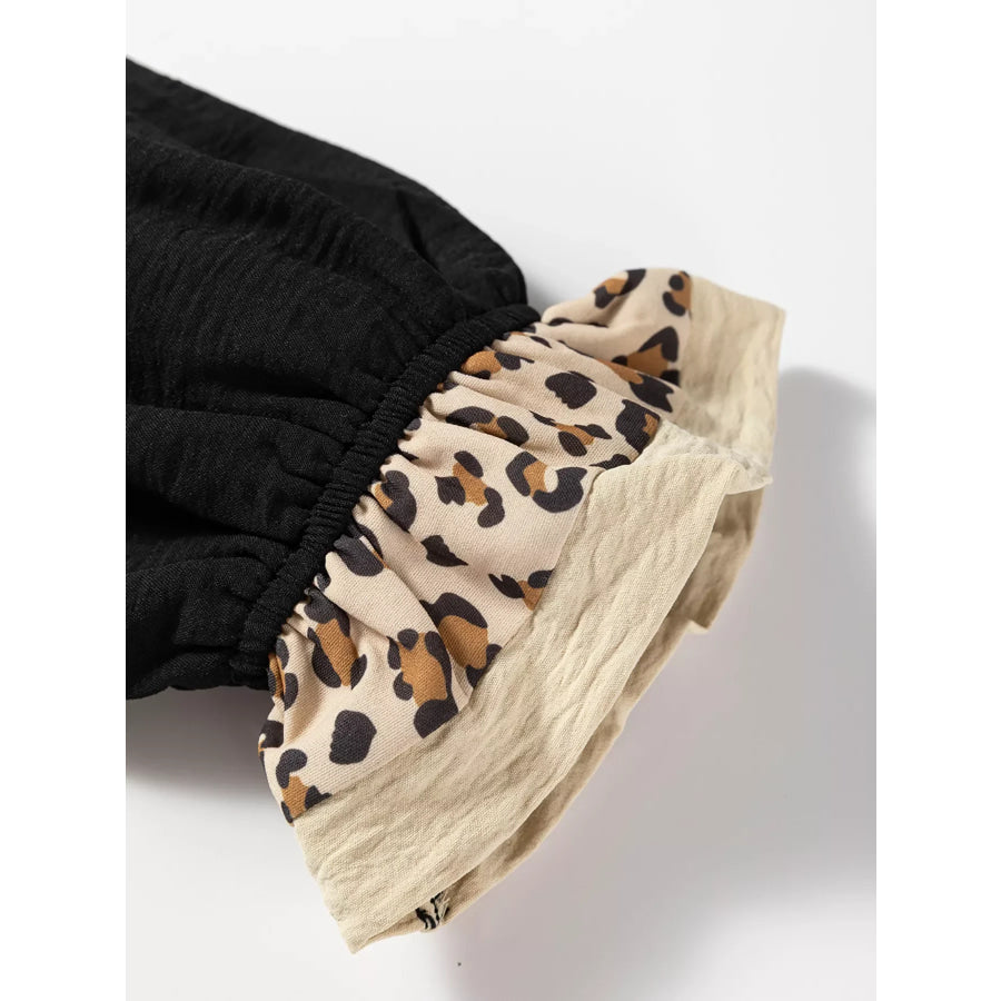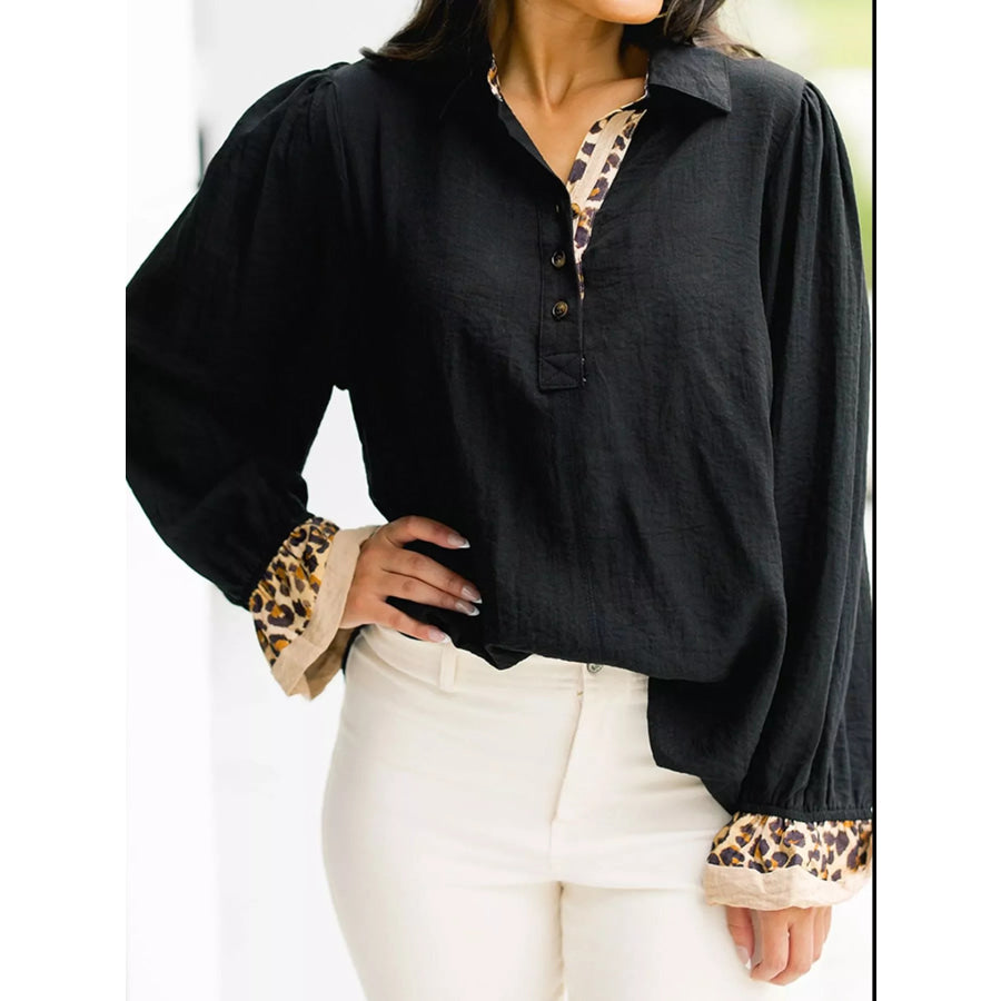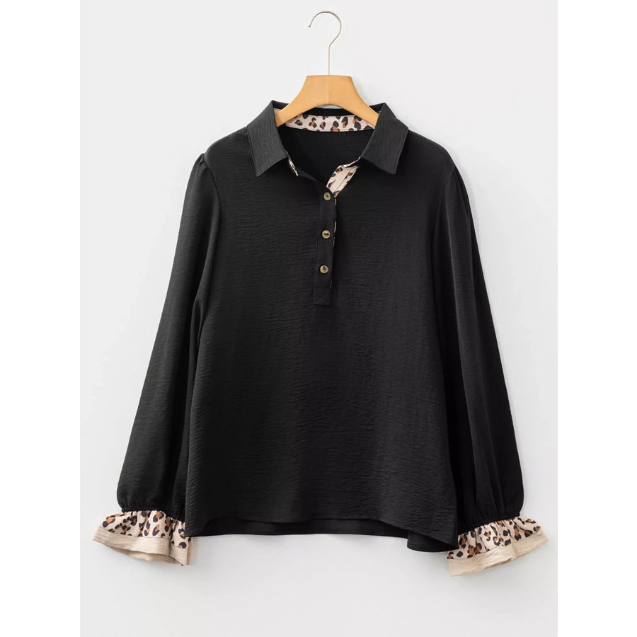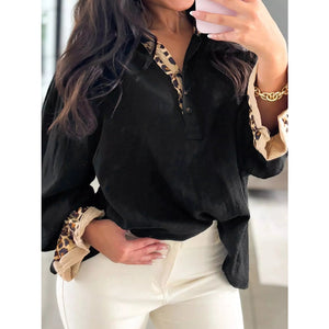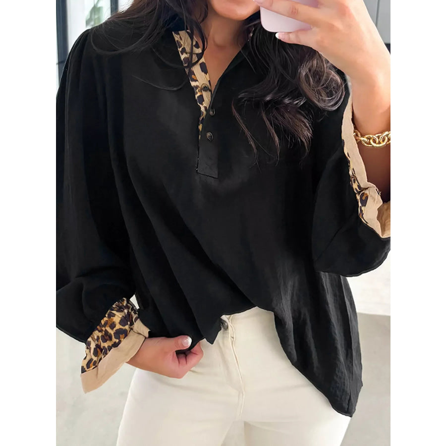 Contrast Leopard Print Patchwork Polo Collar Buttons Front Long Sleeve Blouse