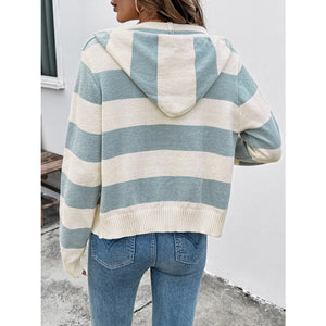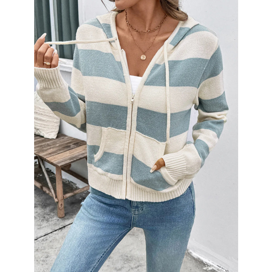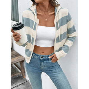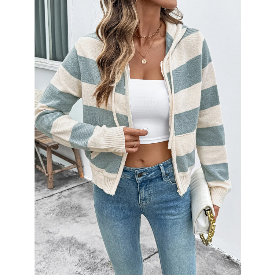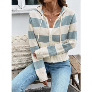 Drawstring Zip Up Striped Cardigan