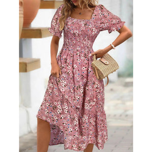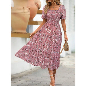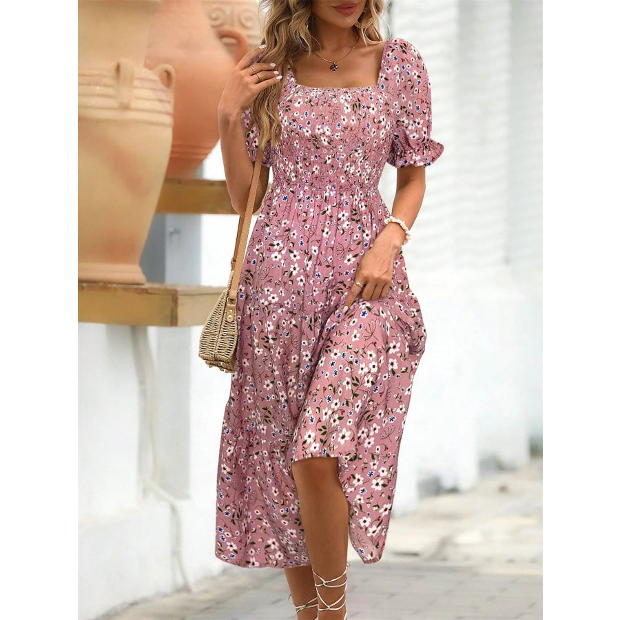 Floral Print Puff Sleeve Tiered Midi Dress