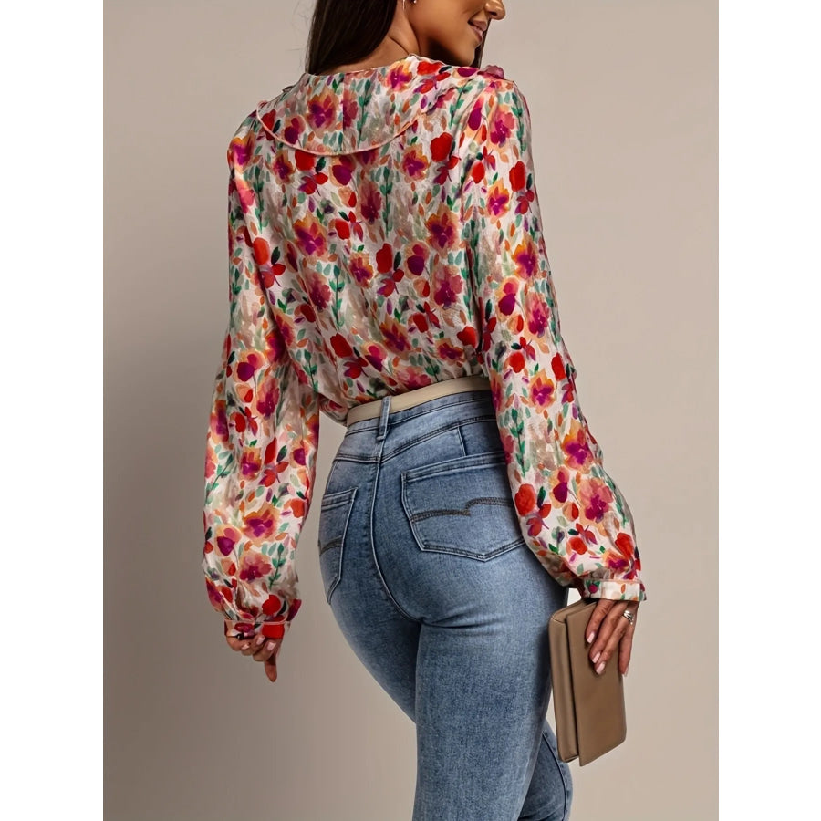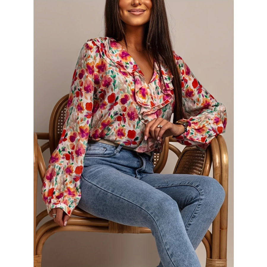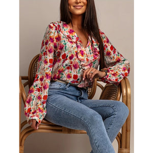 Floral Print Ruffle V-Neck Long Sleeve Blouse