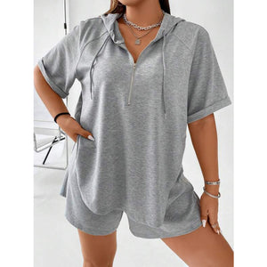 Full Size Drawstring Half Zip Hooded Top and Shorts Set Plus Size