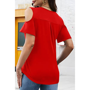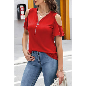 Full Size Half Zip Cold Shoulder Top