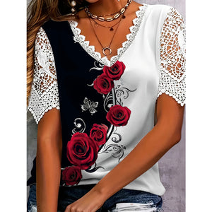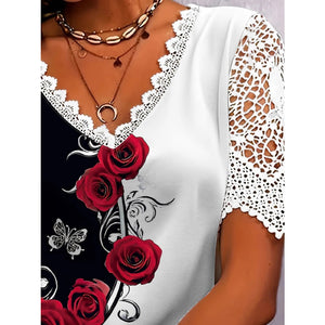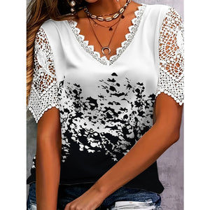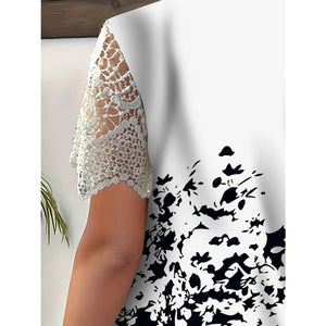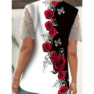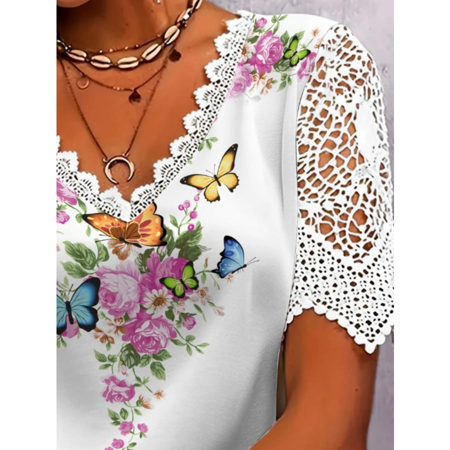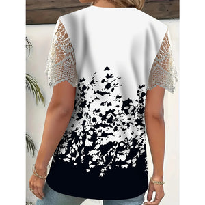 Full Size Printed Lace Sleeve V-Neck T-Shirt Plus Size