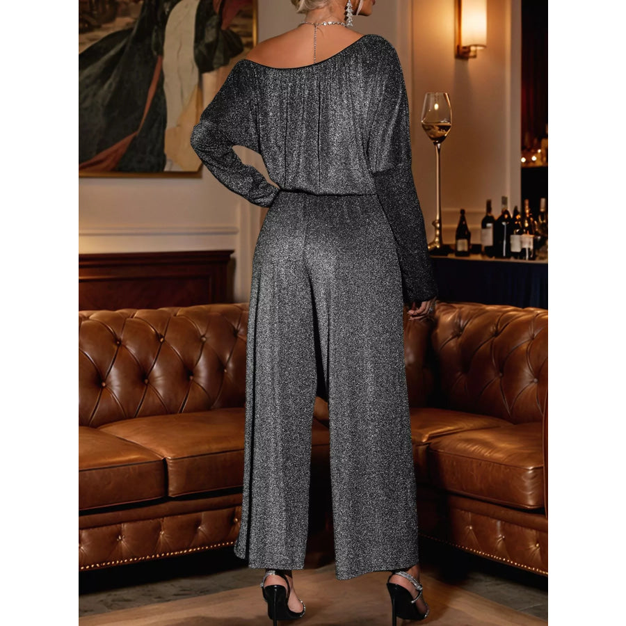 Glitter One Shoulder Long Sleeve Wide Leg Jumpsuit