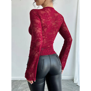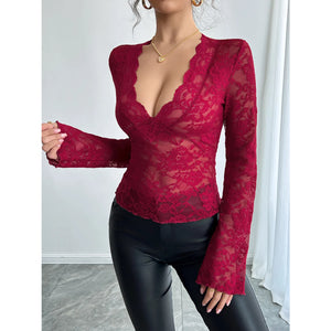 Lace Deep V-Neck Long Sleeve T-Shirt