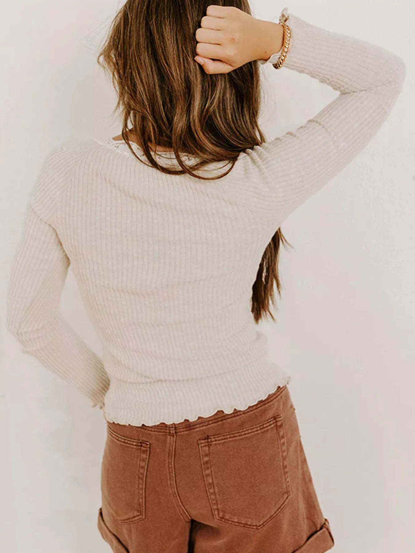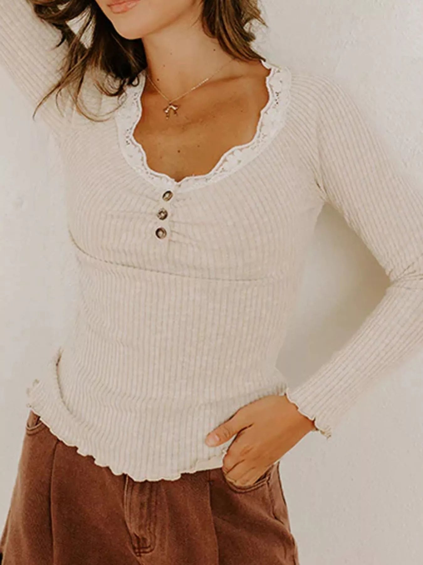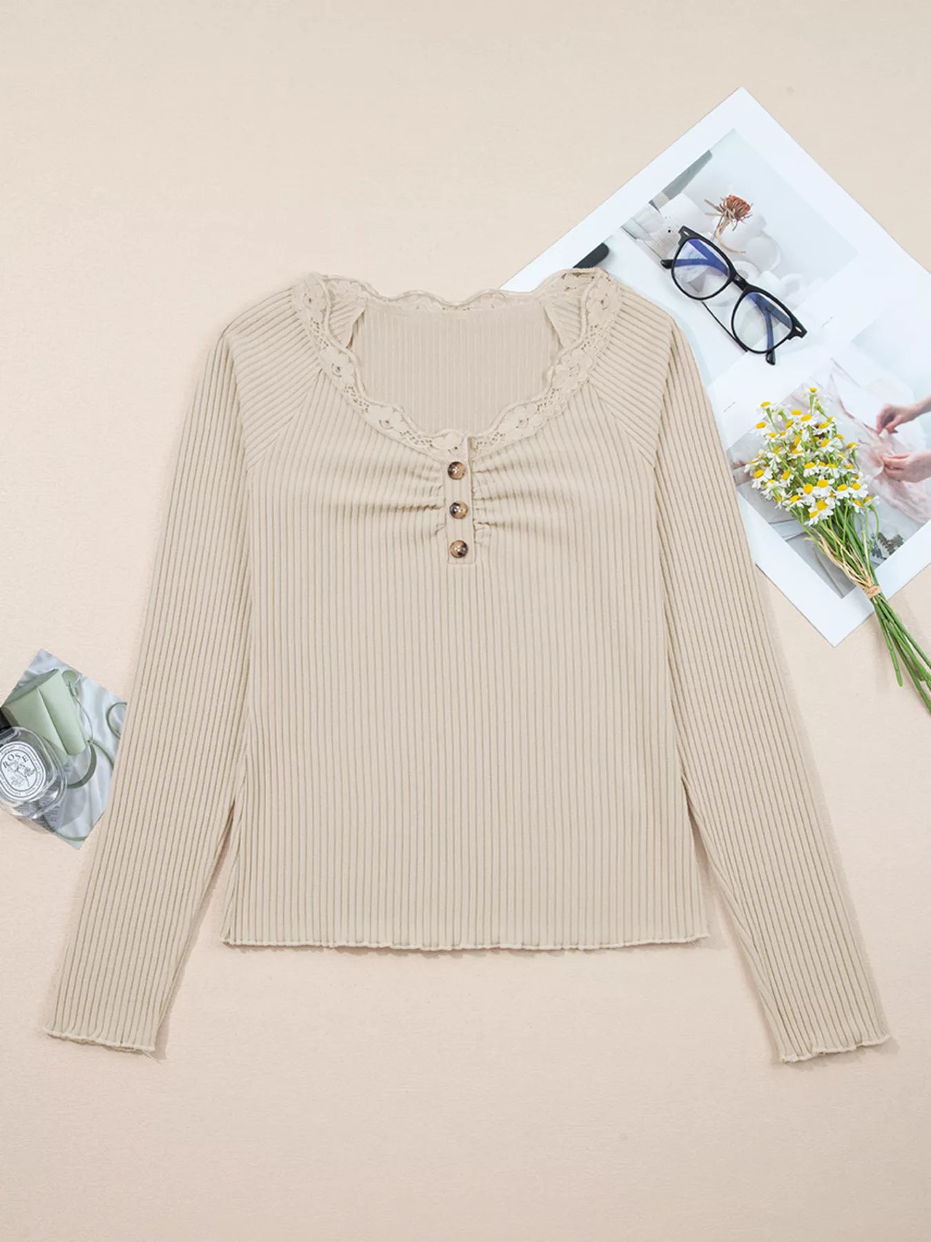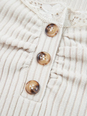 Lace Neckline Button Decor Lettuce Edge Long Sleeve Ribbed Top