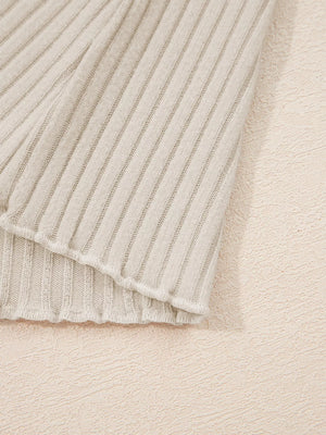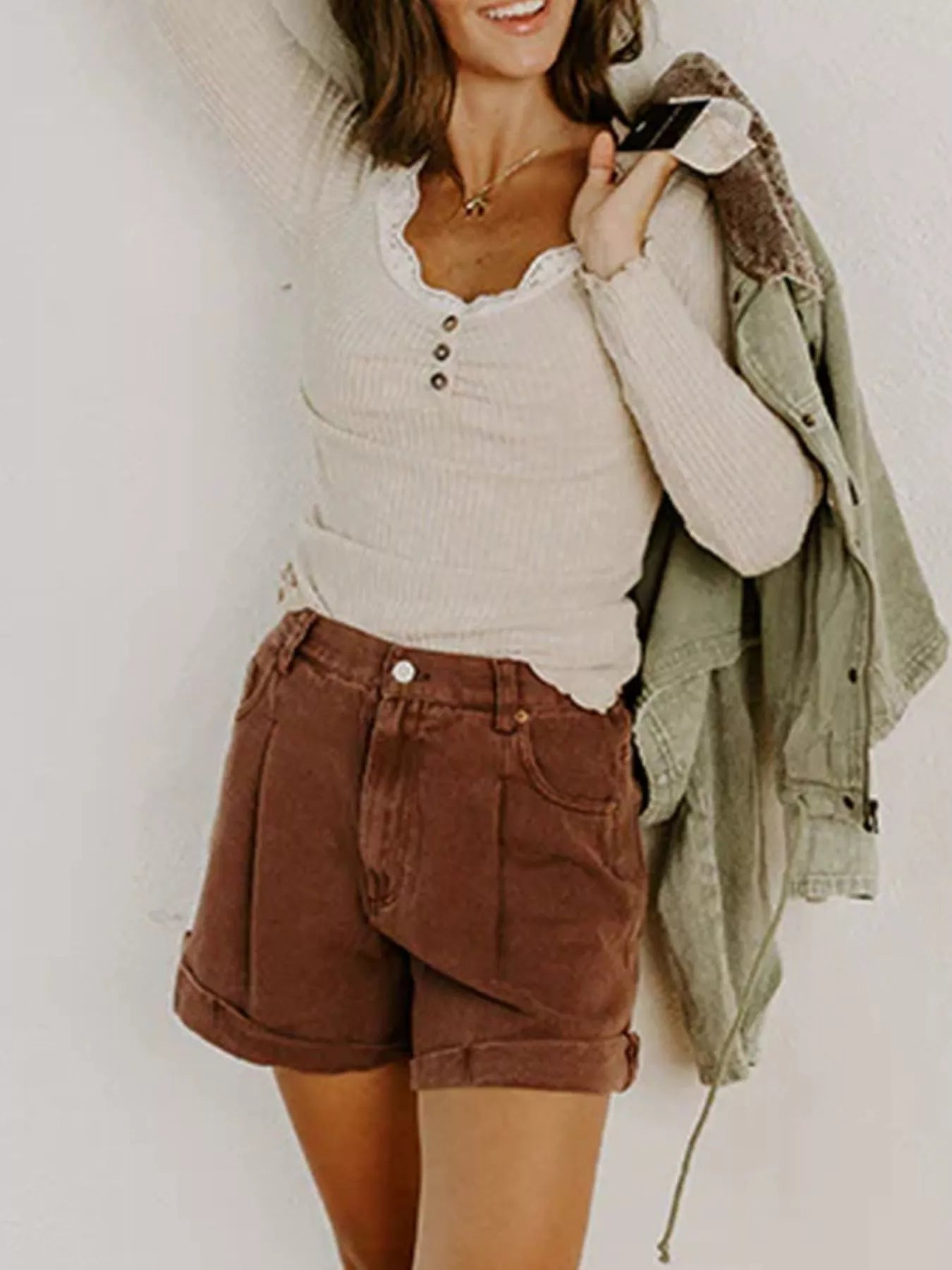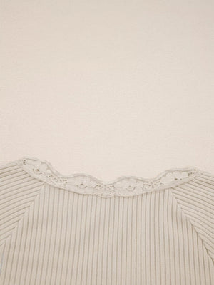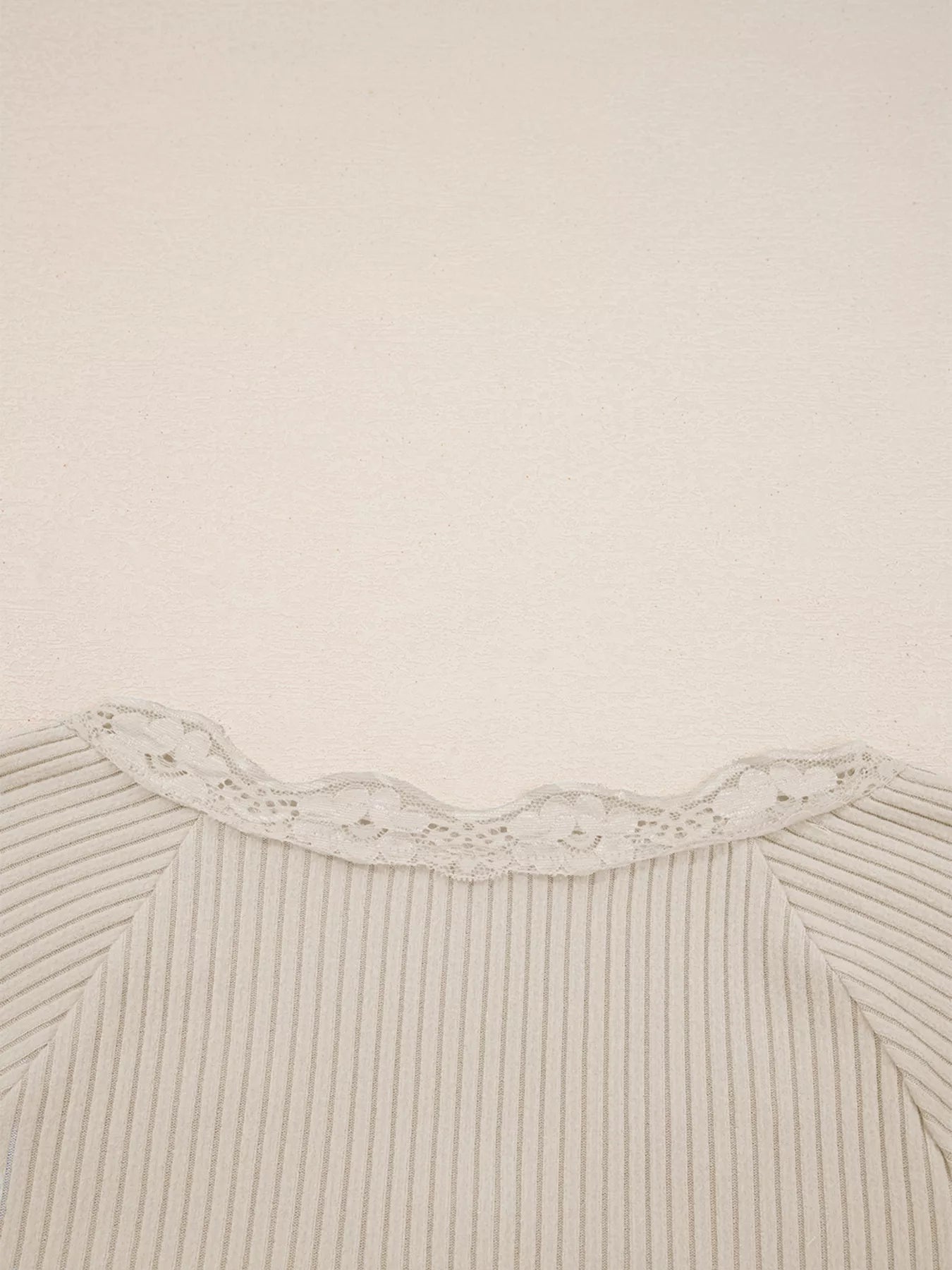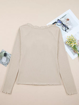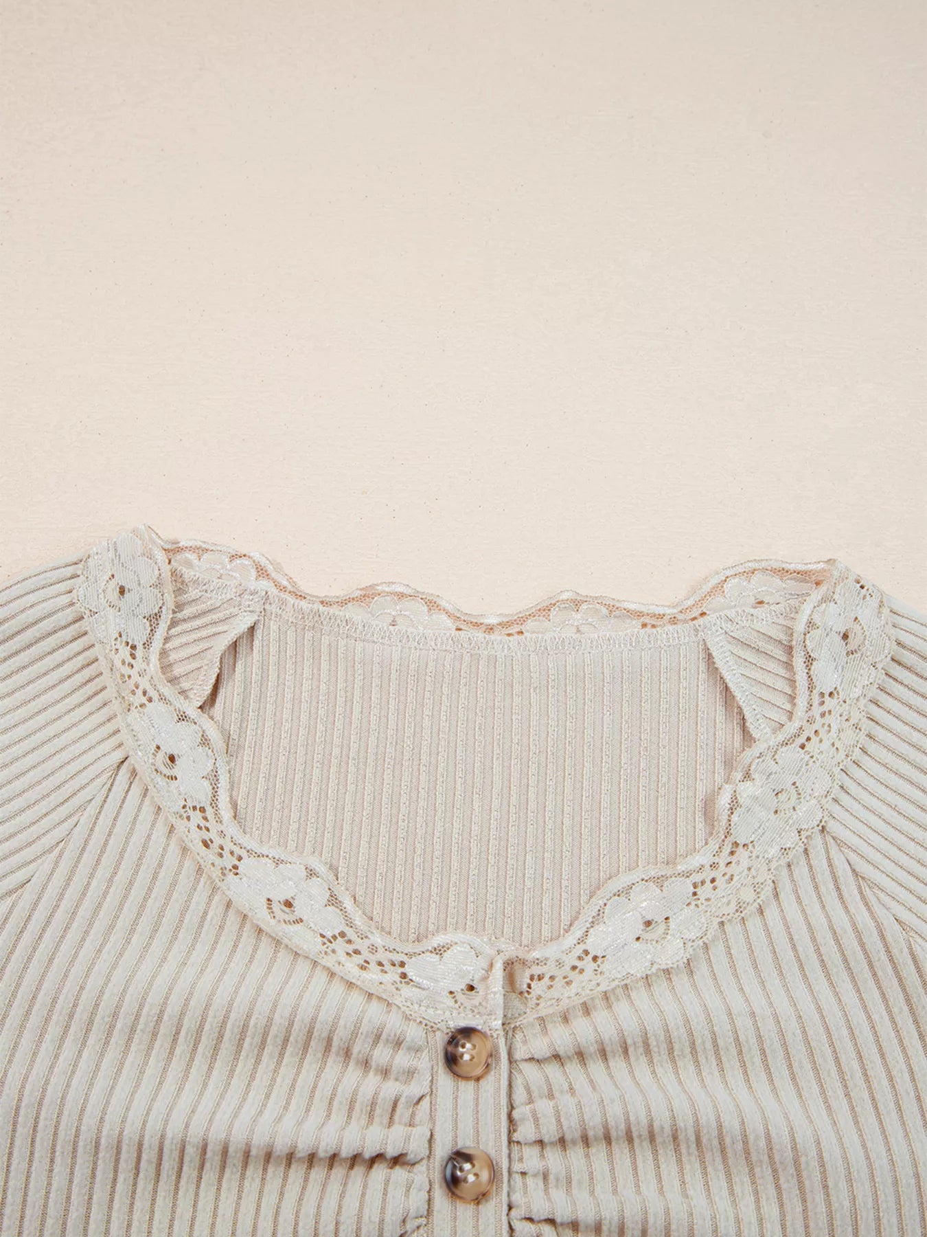 Lace Neckline Button Decor Lettuce Edge Long Sleeve Ribbed Top