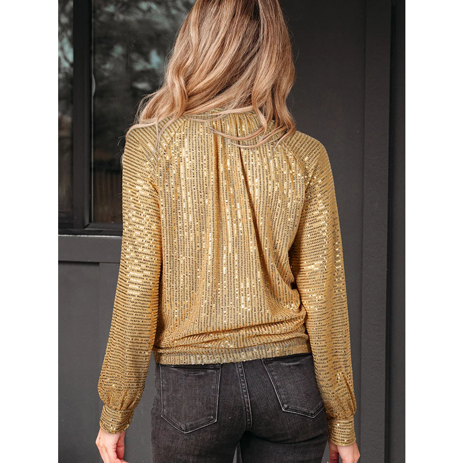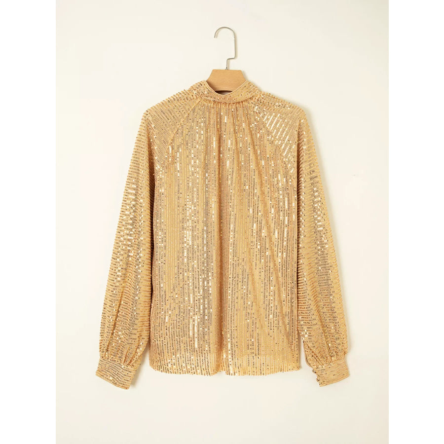 Metallic Balloon Sleeve Buttoned High Neck Loose Blouse