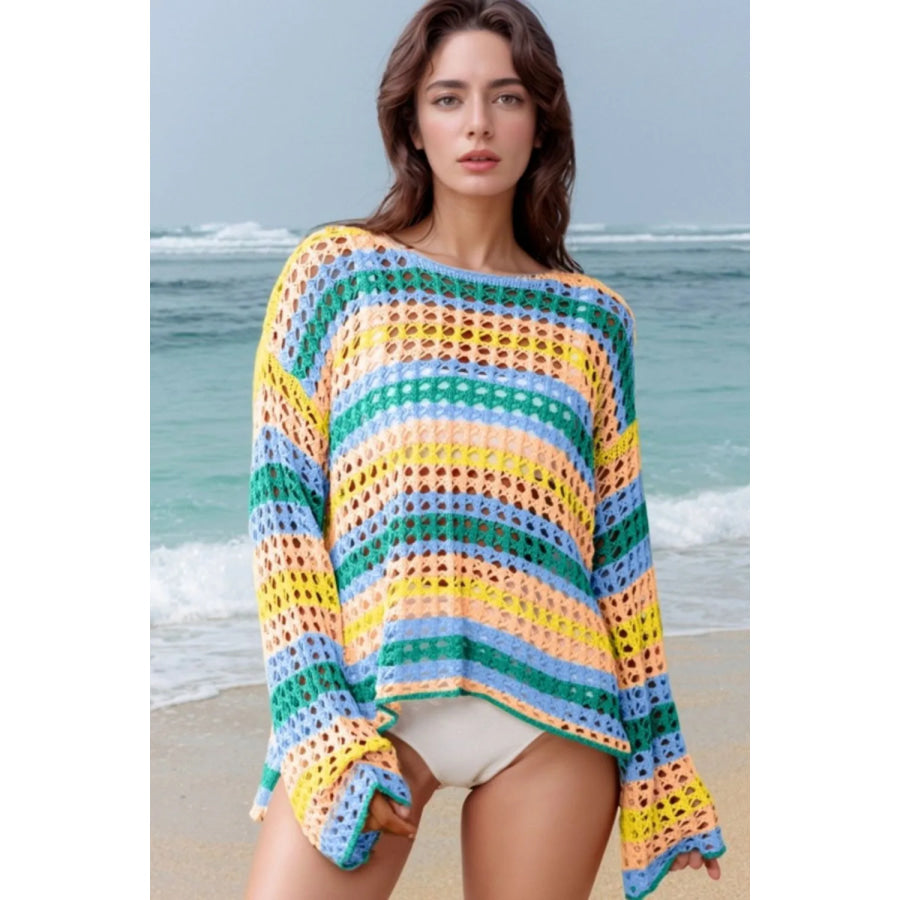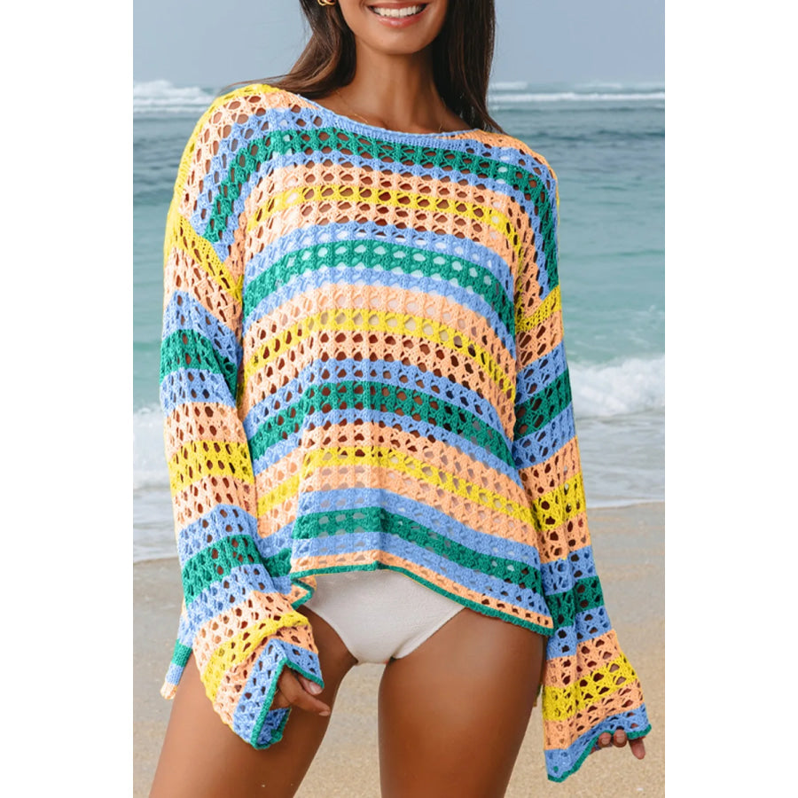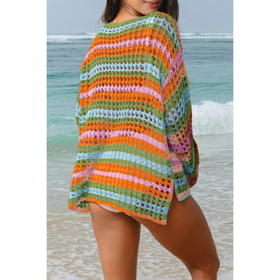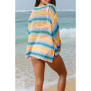 Openwork Round Neck Long Sleeve Knit Cover Up