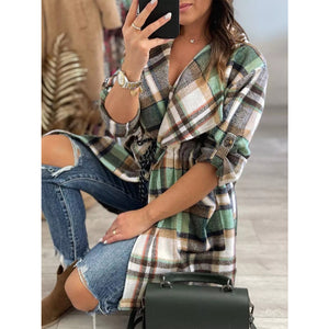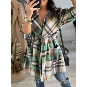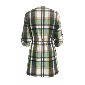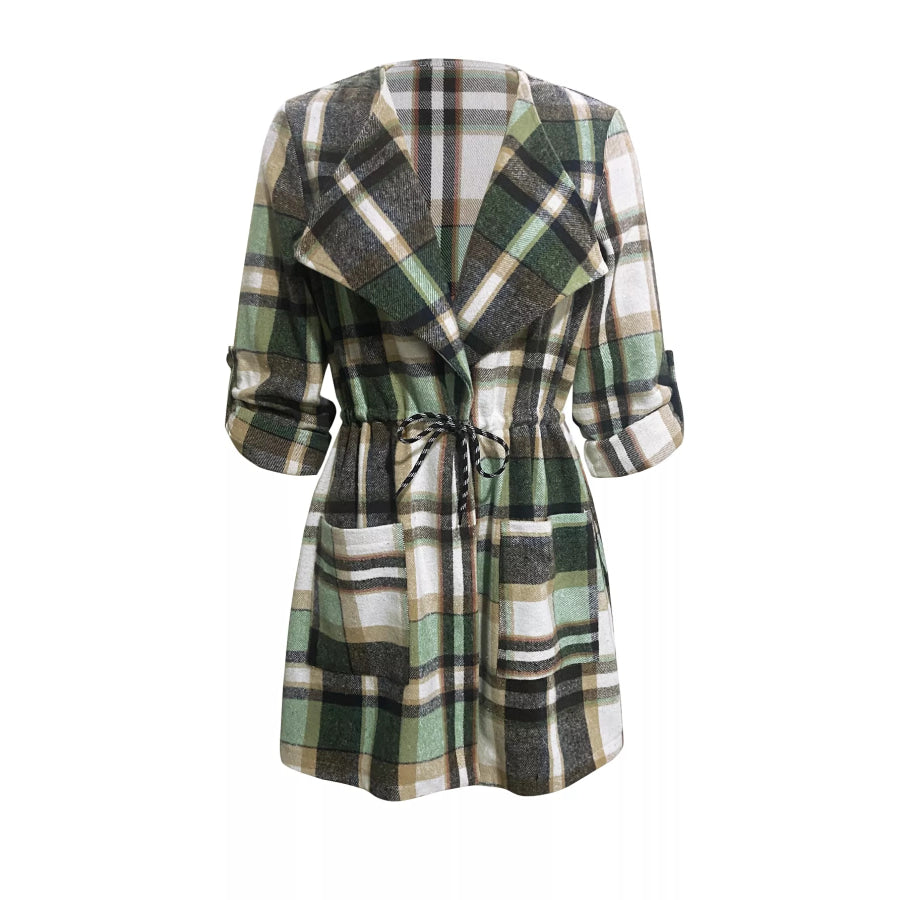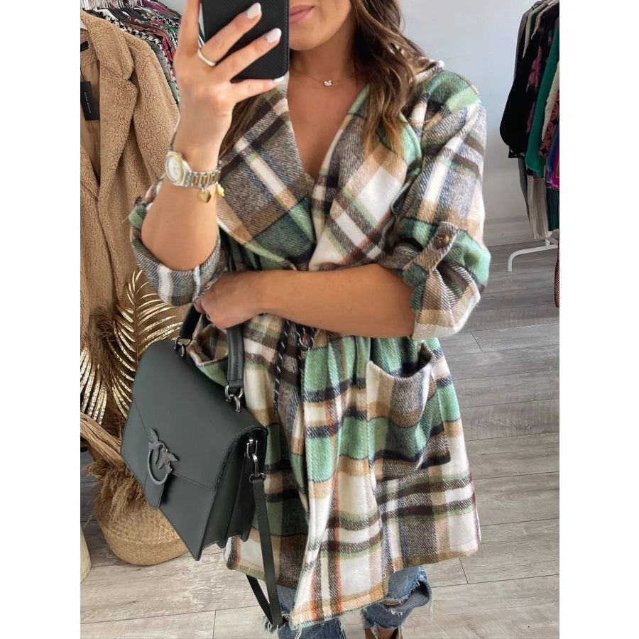 Oversized Drawstring Plaid Button Front Shirt