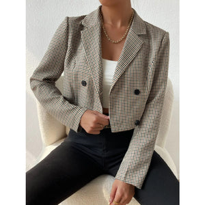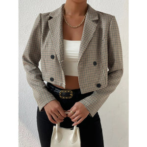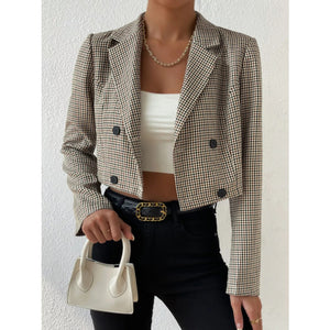 This sophisticated cropped blazer features a timeless black and white gingham plaid pattern that embodies classic elegance. Crafted from high-quality woven fabric, it showcases a structured lapel collar and double-breasted button closure for a professional yet fashion look. The cropped silhouette creates a modern feminine shape while the tailored construction ensures a flattering fit. Perfect for both business casual and smart casual occasions, this versatile piece can be dressed up or down. The monochrome plaid pattern adds visual interest while remaining effortlessly chic and easy to style with various wardrobe pieces.