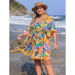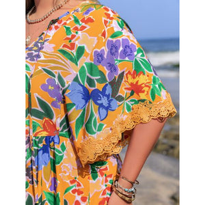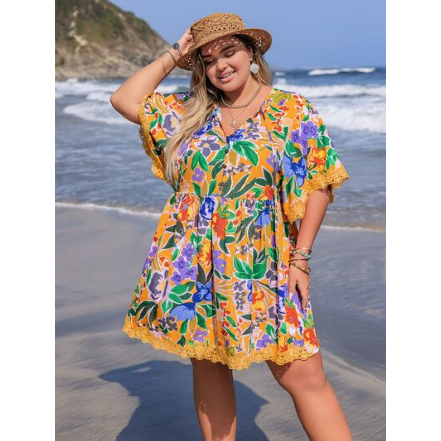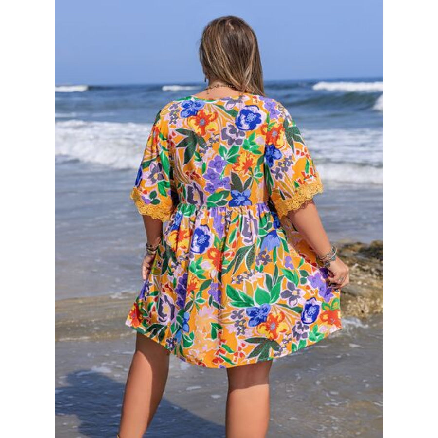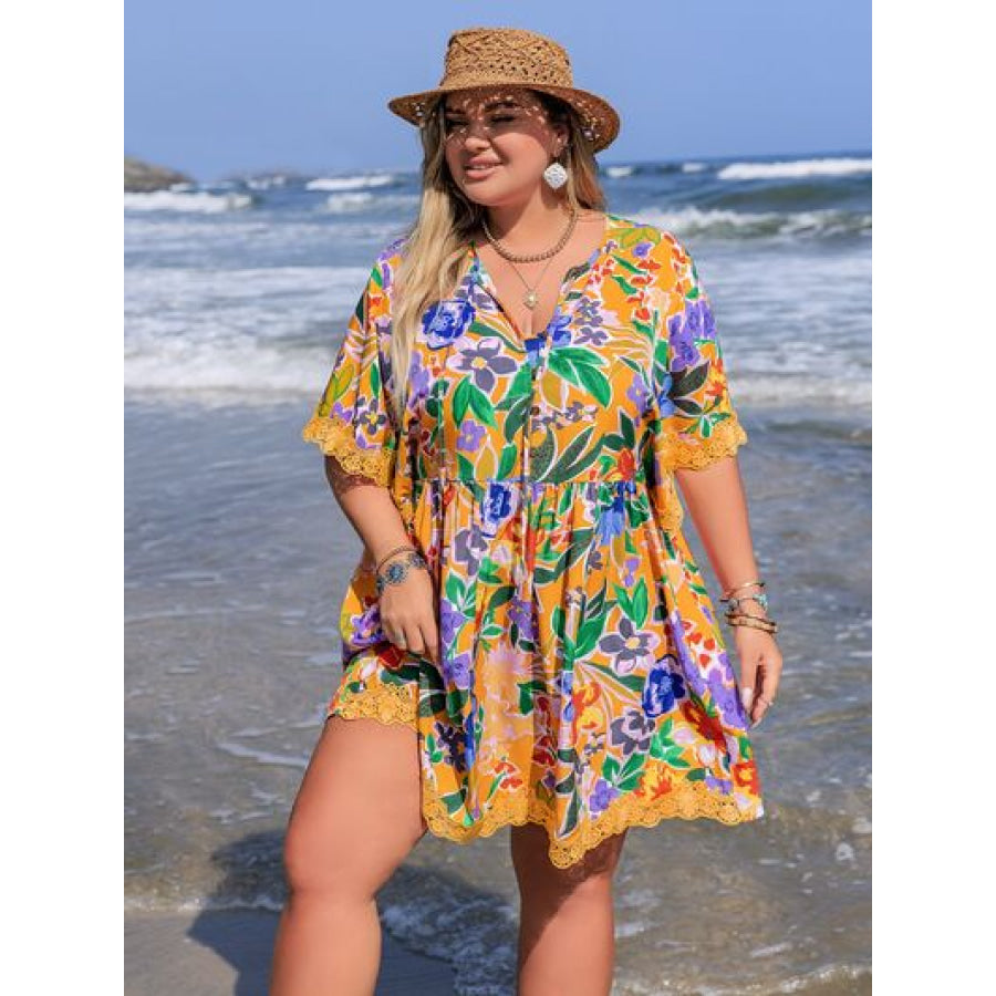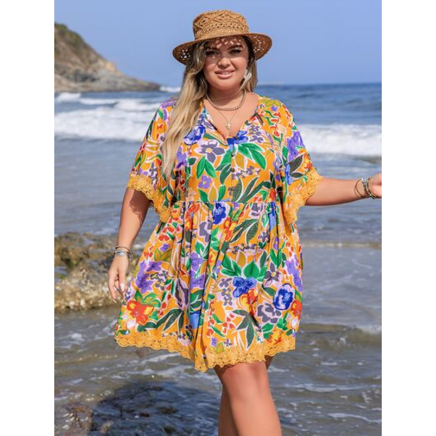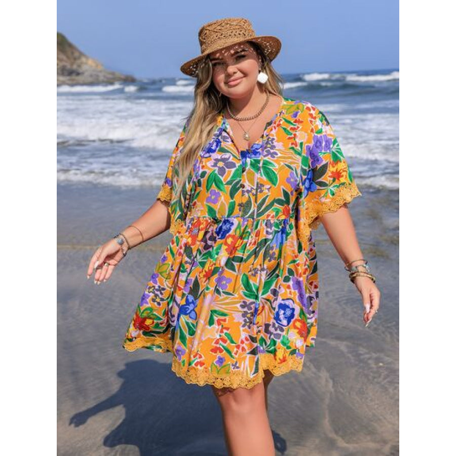 Plus Size Lace Detail Printed Tie Neck Half Sleeve Dress