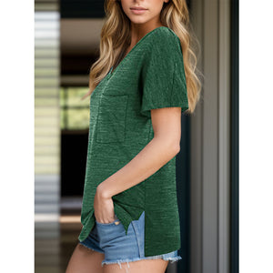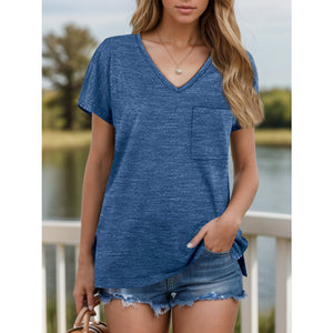 Pocketed Heathered V-Neck Short Sleeve T-Shirt